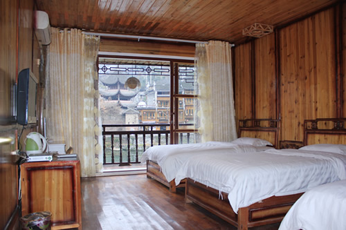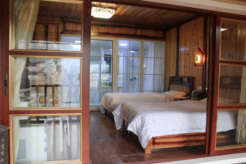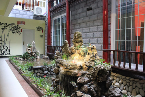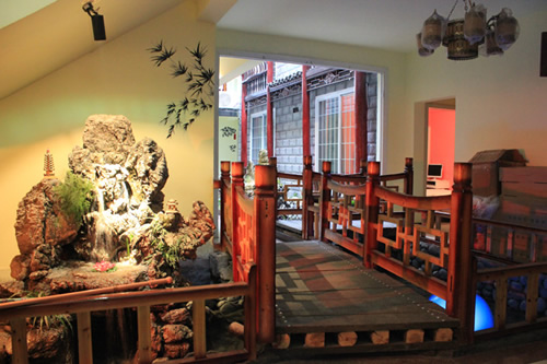 古樸的客房內(nèi),超大陽臺全景落地窗,是您欣賞沱江風(fēng)光帶首選客棧,兩座百年四合院內(nèi)小橋流水,假山錦鯉,一百三十平米休閑花園別具情調(diào)。紅酒加咖啡的大堂吧、彩色精致的情調(diào)房、古典高雅的臨江觀景房以及大型公共觀景平臺,龍閣的點(diǎn)點(diǎn)滴滴都透著出古城的神韻和幽靜,走進(jìn)龍閣客棧,給您一個完美的鳳凰古城沱江全景!