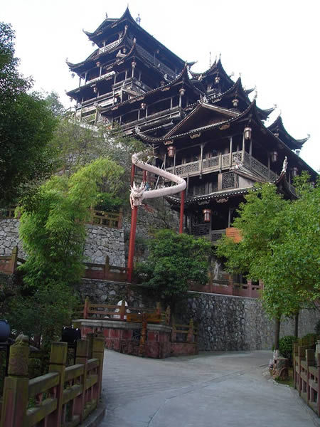 九重天 九重天世襲堂是土家風(fēng)情園的精華和靈魂所在。該建筑由土家民間藝人李宏進設(shè)計,依80度陡坡而建,高48米,共9重12層,整個樓房全部用木栓連接,沒有一顆鐵釘,堪稱土家族建筑史上的奇跡。2002年9 月22日,九重天吊腳樓被載入世界吉尼斯世界紀錄,認定其為目前中國最大、最高、最完美的木質(zhì)結(jié)構(gòu)吊腳樓。2001年4月6日,朱镕基總理視察土家風(fēng)情園時,對九重天贊不絕口:“一批民間匠人能造出這樣輝煌的吊腳樓,而且還解決了力學(xué)的問題,真是不簡單。”清華大學(xué)著名建筑學(xué)家何重義先生說:“張家界土家風(fēng)情園完全可以和蘇州的園林相媲美。特別是九重天世襲堂,猶如玉宇瓊閣,令人神往!”古人說,天有九野,地有九州,土有九山,山有九寨。古人又把九重叫做天,說天有九重,最上一重是上帝和君主居住的地方,所以我們叫它“九重天”。