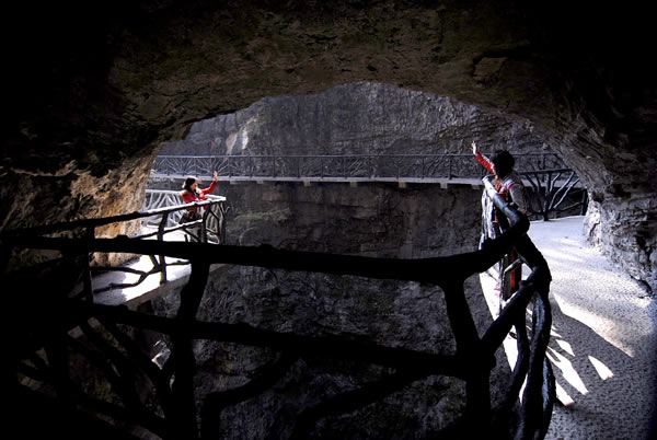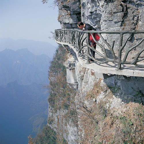 據(jù)施工人員介紹,此條棧道也是他們所修棧道中施工最難,最險(xiǎn)峻的一條。如果您還覺得不夠刺激的話,在棧道的完結(jié)處的兩個(gè)懸崖之間有一條長160米的懸索吊橋,同時(shí),在海拔最高點(diǎn)還有一個(gè)挑戰(zhàn)心里極限的玻璃站臺(tái),在這里,如果你能挺直腰板伸開雙臂,那么,您就是真正的勇士了。