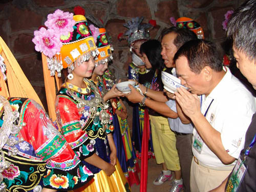 攔門酒 攔門酒是苗家山寨的一種古老的習俗,其中以叭咕苗寨最為盛行和最有特色。苗家娶親嫁女,親戚朋友都要上門送禮賀喜。好客的主人和賢惠大方的親朋戚友,總是要把這門喜事辦得體面熱鬧,同時也總是要借個良好的機會展示自己的富有,廣交朋友。主人把事先早已準備好的包谷燒酒,請來寨子里德高望重的族老和歌師,在自家的大門口擺下大方桌,桌子上擺滿了一碗碗噴著清香的美酒?腿藖頃r,由主管把門的族老首先唱講賀詞,然后,客人中最年長且聲望高的長者唱答謝詞。 祝賀詞: 最尊敬的客人, 你們不怕旅途辛苦, 來到我們這個貧窮的地方, 山路雖然狹窄陡險, 總有你落腳的梯坎, 泥濘雖然臟滑, 青石板路平穩(wěn)而又閃光。 你們的到來, 給冷落的苗寨增添了無限的喜悅, 屋背后的錦雞, 它是歡迎你們這些尊貴的客人。 苗寨雖然偏僻貧寒, 但苗家個個都有一顆火熱的心腸。 沒有什么好地東西接待你們, 苗家的包谷燒酒格外甜蜜飄香。 攔門酒是苗家待客的最高禮節(jié), 請你們不要擔驚慌。 一碗酒是苗家的深深情意, 一碗酒是苗家獻給你的一顆火熱的心房。 喝了這甜蜜蜜的攔門酒, 你的臉上閃現(xiàn)出幸福的紅光。 喝了這碗香噴噴的攔門酒, 你的貴體將會更加健康強壯。 喝了這碗同心酒, 我們的心貼得更緊, 我們的友誼更加加深。 答謝詞: 最尊貴的主人, 你們的接待是這樣的周到, 你們的熱情是這么的執(zhí)著真誠。 我們雖然是遠方的陌生人, 到了這里卻親如一家人。 說什么苗鄉(xiāng)偏僻落后, 這里處處充滿了幸福的景象, 說什么苗鄉(xiāng)沒有什么上好的禮品招待, 友好的民族使我們體驗到了人間真正的友情。 包谷燒酒噴灑著撲鼻的芳香, 一陣陣溫暖了我們火熱的心房, 這是上好上好的禮品喲, 讓我們盡情意地品嘗。 紫竹林里的花錦雞, 聲聲叫得歡喲, 給苗寨帶來了幸福與吉祥。 我們遠方的客人今日來到苗寨, 為苗寨帶來歡樂與安康。 接過一碗碗香噴噴的包谷燒酒, 讓我們共同痛飲品嘗, 苗寨的好日子濃似包谷燒酒, 我們的友情啊地久天長。 祝賀詞和答謝詞之后,主人把早已想好了的農(nóng)事或家事其日常生活的要事向來客提問,接謝人隨問隨答,然后由族長十分恭敬地雙手舉起盛滿包谷酒的酒杯,遞給一個年長客人,一碗一碗地讓客人們喝下這香醇美的包谷燒酒。一切儀式做完之后,說聲:“得罪了,最尊貴的客人”,客人答一聲“請不要客氣,我們都是一家人”。這時,酒門大開,攔門人很禮貌地讓開一條道路恭迎客人進屋。 攔門酒的習俗十分原始古老,它體現(xiàn)了苗家禮貌待客坦誠交友的良好道德風范。 |