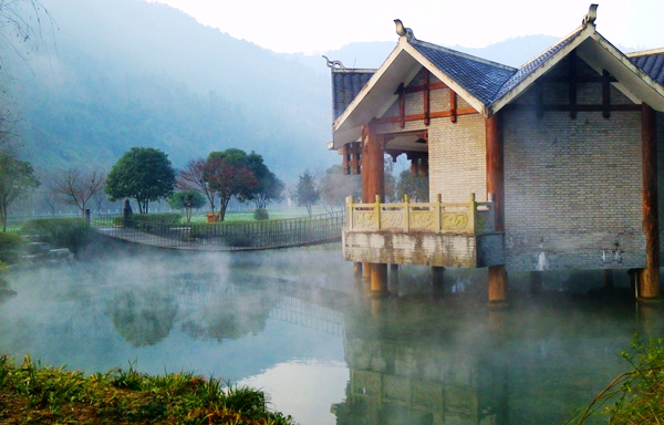 “泉源沸涌,浩氣云浮!睋(jù)了解,黃龍洞生態(tài)廣場的水源出自于洞內(nèi)的地下河,水溫常年保持在16攝氏度左右。當(dāng)從洞內(nèi)流淌出來的溫暖水流與洞外的低溫空氣相遇之后,頓時(shí)形成沸騰的水汽,從而形成“浩氣”景觀。